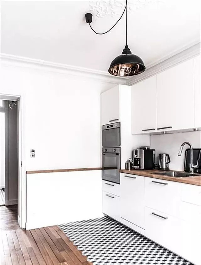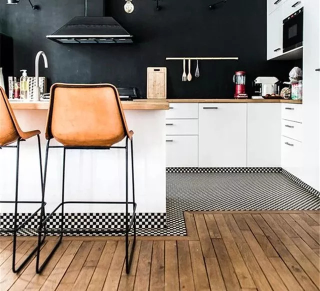 如果家里整體非常亮堂,可以在廚房鋪黑色不規(guī)則地磚,簡單耐看。