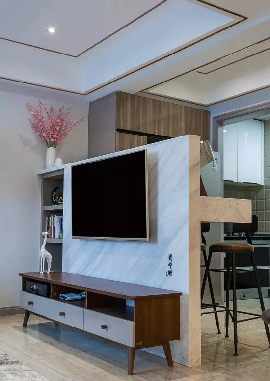 ②電視柜、餐邊柜在隔斷的同時(shí)還能做很多收納。