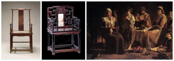左:黃花梨四出頭官帽椅【明】。中:紫檀“風(fēng)光和雅”太師椅【清】。右:路易•勒南《農(nóng)民家庭》(1593-1648)。