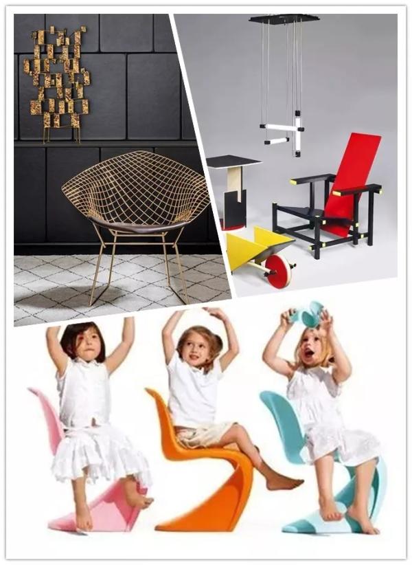 左上:HarryBertoia設(shè)計(jì),鉆石椅(1950-1952)。右上:Gerrit Thomoas Rietveld設(shè)計(jì),紅藍(lán)椅(1918-1923)。