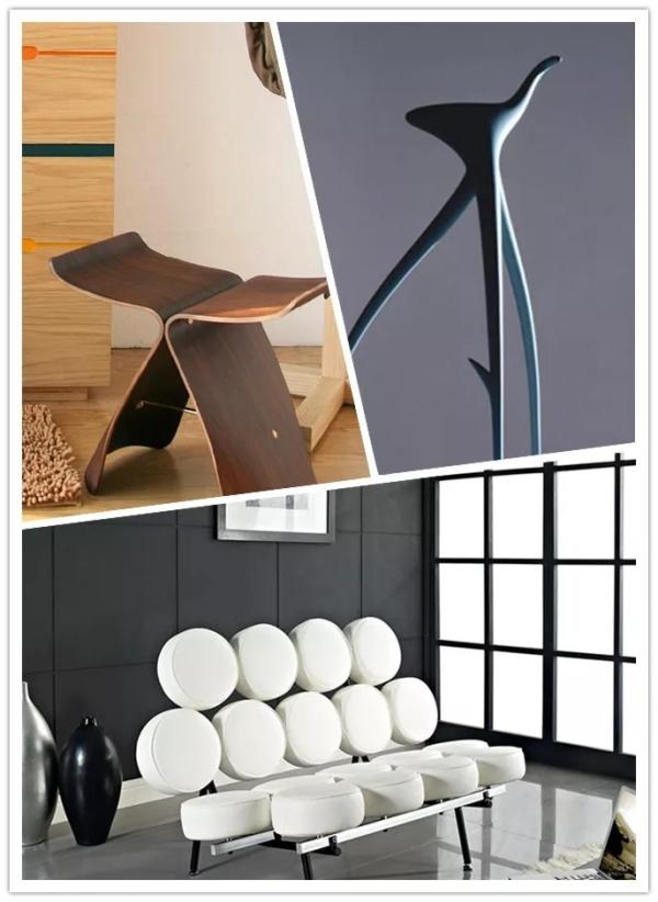 左上:柳宗理設(shè)計(jì),蝴蝶凳(1956)。右上:PhilippeStark設(shè)計(jì),W.W椅(1990)。下:George Nelson設(shè)計(jì),棉花糖椅(1956)。