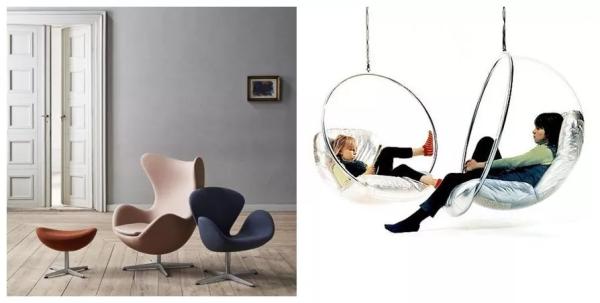 左:Arne Jacobsen設(shè)計(jì),天鵝椅(1957-1958)。右:Eero Aarnio設(shè)計(jì),球椅(1963-1965)。